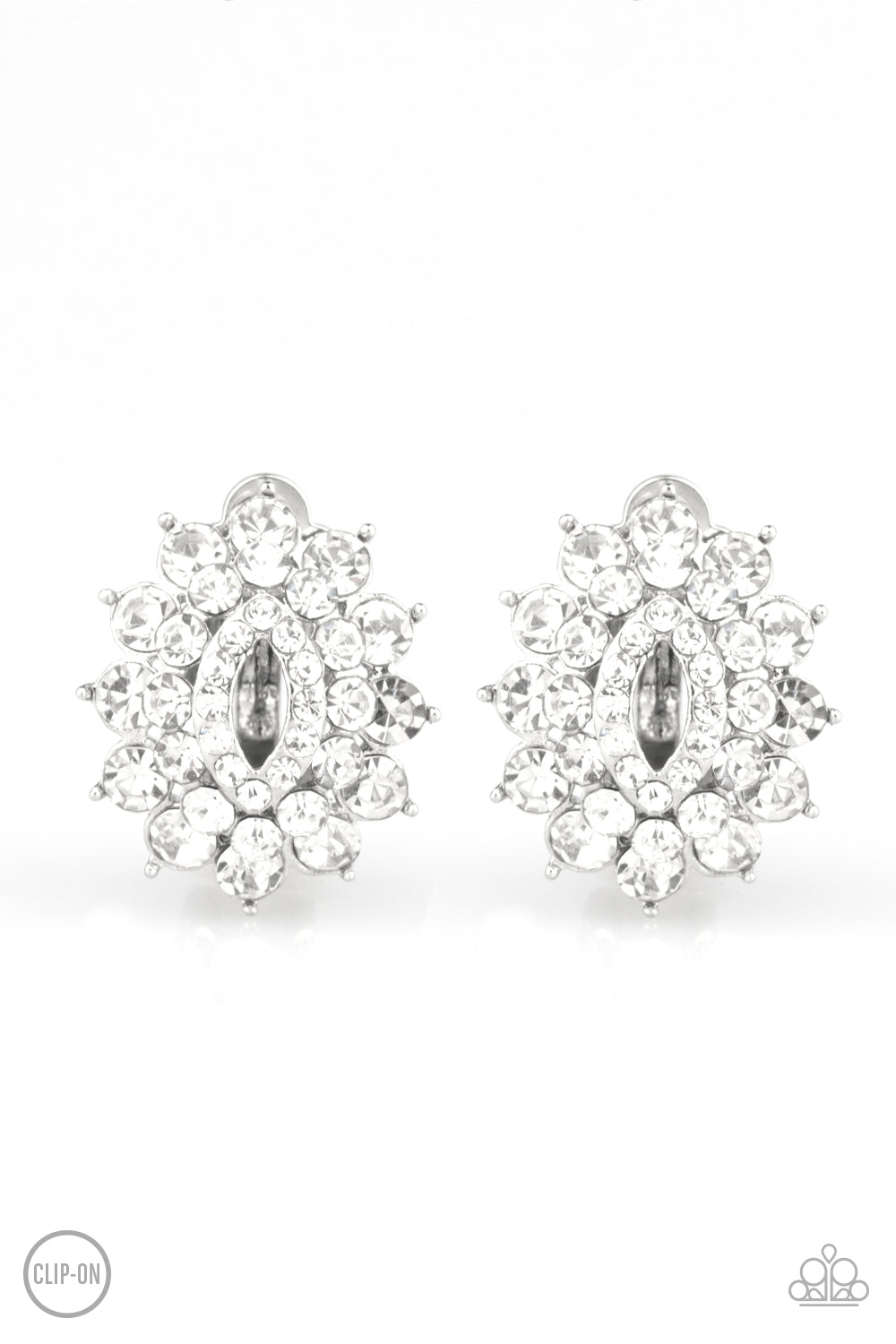 Varying in size, frames for glass white rhinestones stack into a glamorous frame for blinding look. Earring attaches to a standard clip-on fitting.