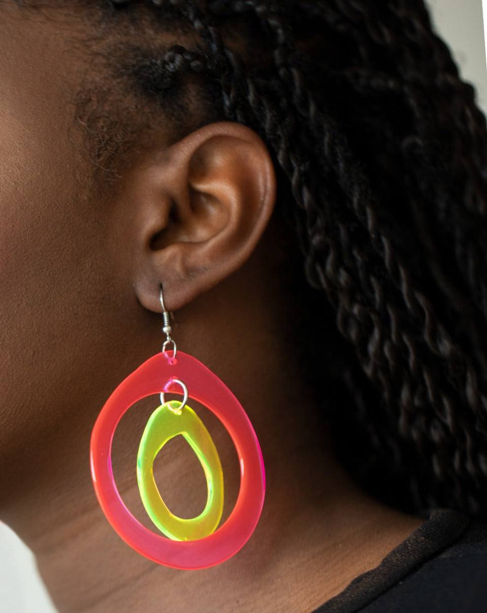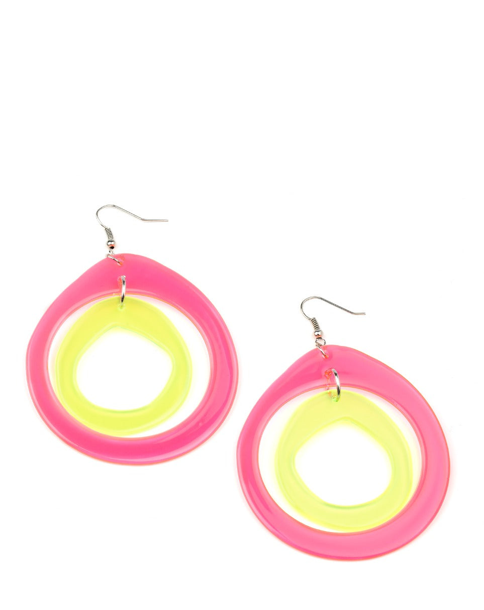 Featuring asymmetrical shapes, neon pink and yellow acrylic hoops link into a dizzying lure for an out-of-this-world experience. Earring attaches to a standard fishhook fitting.
