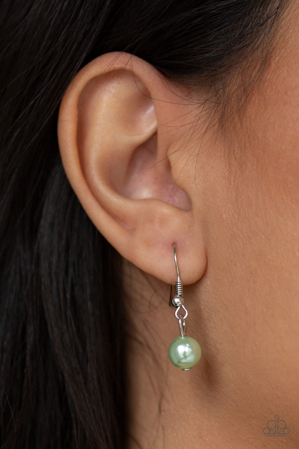 A collection of shiny silver beads and pearly green beads cascade from the bottoms of two layered silver chains. Stamped in the word, "Love", floral heart charms dangle from the lowermost chain, creating a flirtatious fringe below the collar. Features an adjustable clasp closure.