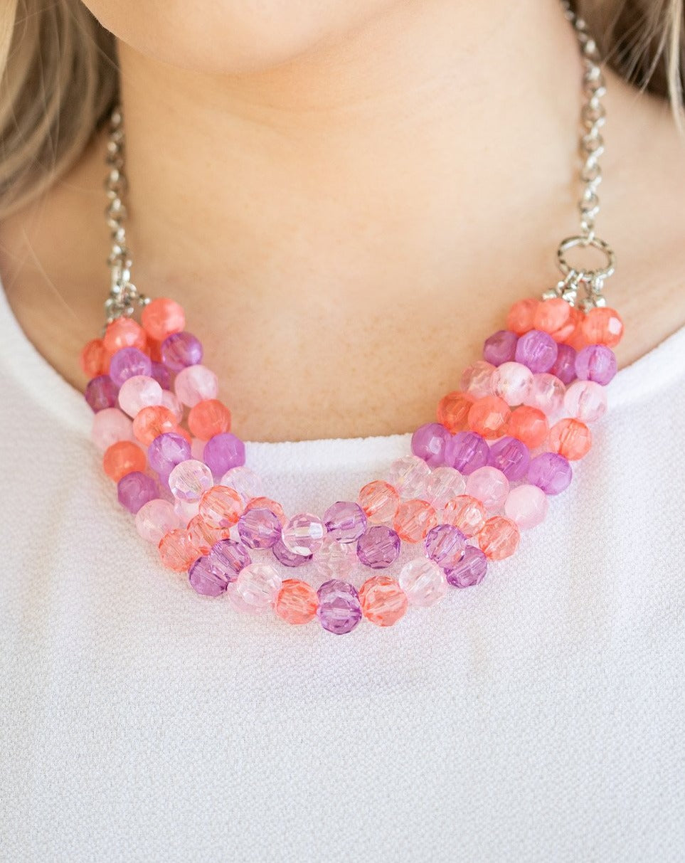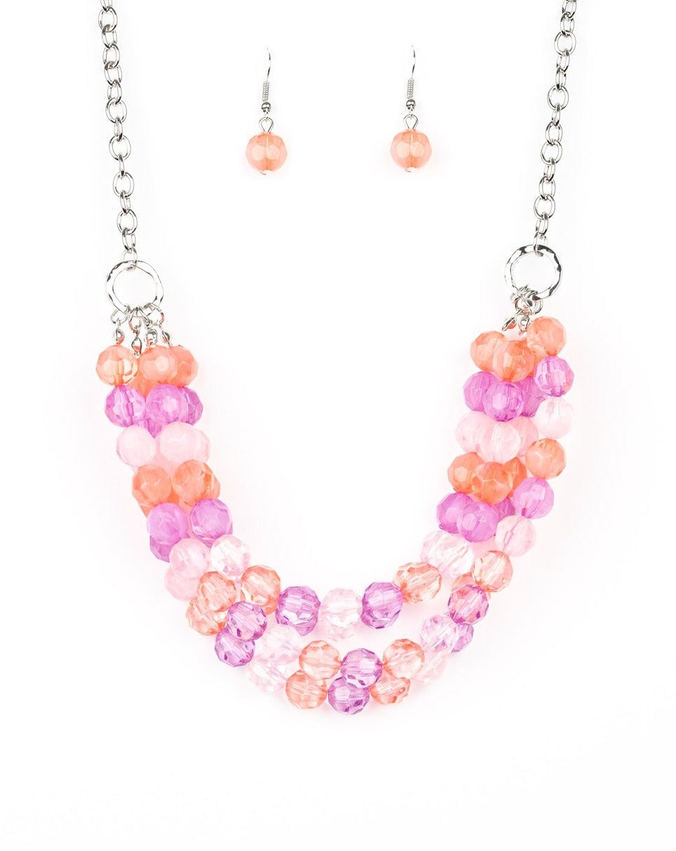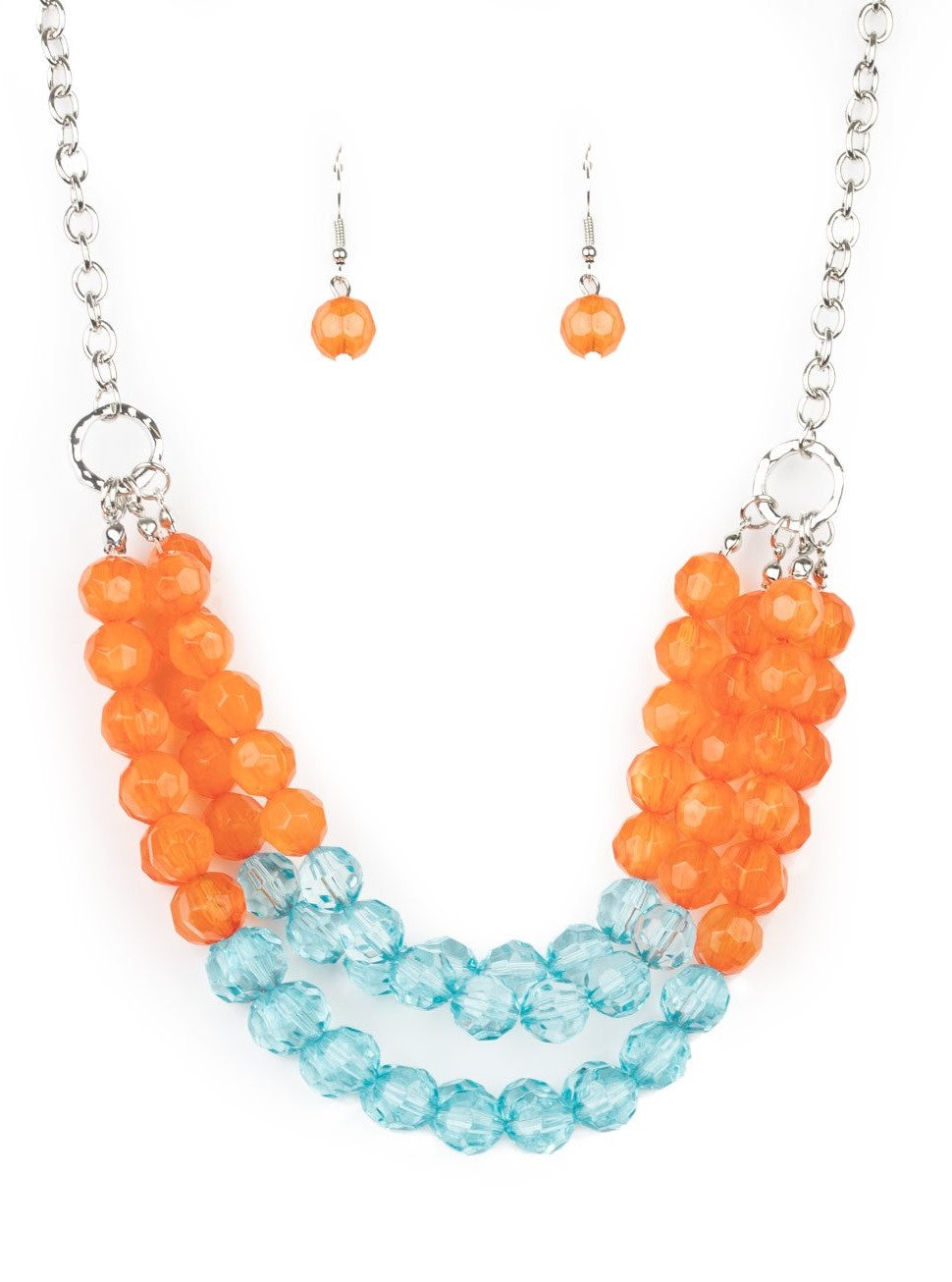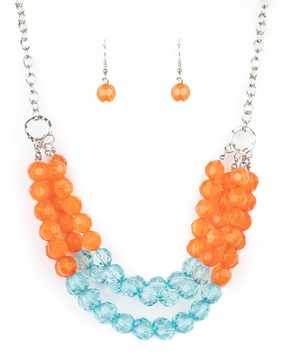 Featuring cloudy and glassy finishes, strands of faceted orange and blue crystal-like beads alternate below the collar, creating colorfully icy layers. Features an adjustable clasp closure.