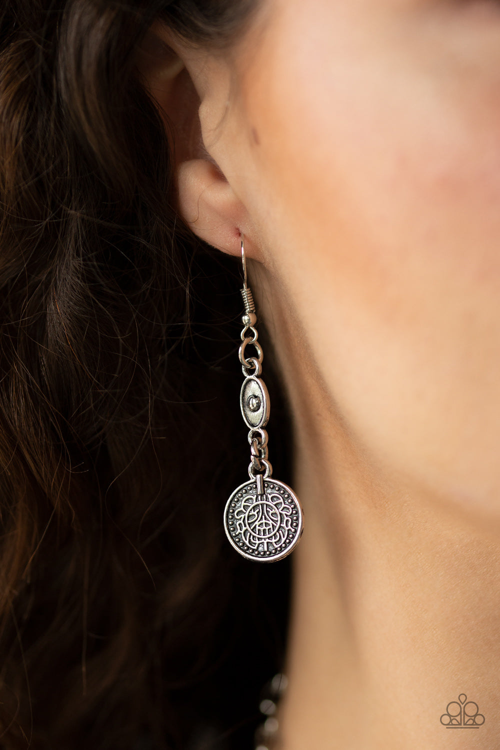 Brass, copper, and silver coin-like accents dangle from the bottom of three ornate silver plates, creating a noise-making fringe below the collar. Features an adjustable clasp closure.