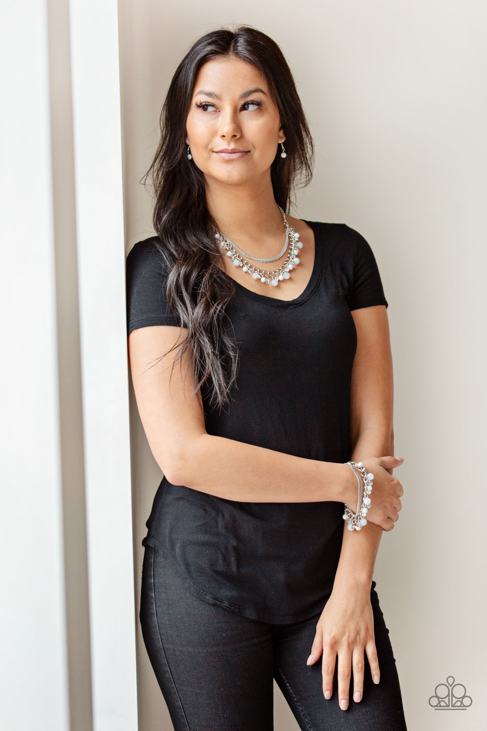 Infused with layers of mismatched silver chains, glassy, polished white, and glittery white rhinestones swing from the bottom of a bold silver chain, creating a bubbly fringe below the collar. Features an adjustable clasp closure.